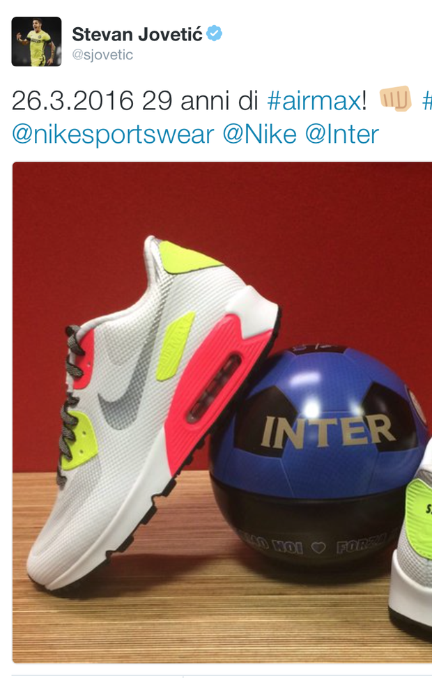 Sulle proprie pagine social, Stevan Jovetic ha voluto celebrare i 29 anni delle Air Max: il 26 marzo 1987, infatti, nascevano le sneakers Nike.