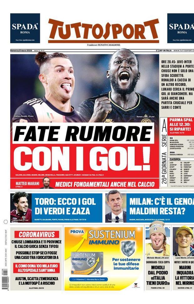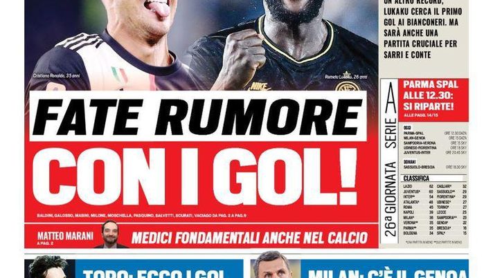 Sulla prima pagina di Tuttosport si parla della grande sfida dello Stadium: "Fate rumore con i gol. Juve-Inter nello Stadium a porte chiuse non è solo una sfida scudetto. Ronaldo a caccia di un altro record, Lukaku cerca il primo gol ai bianconeri. Ma sarà anche una partita cruciale per Sarri e Conte".