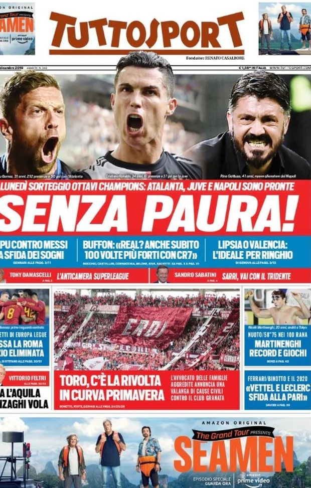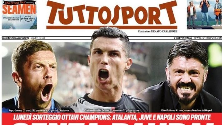 La prima pagina di Tuttosport in edicola venerdì 13 dicembre 2019 non parla di Inter. La copertina è dedicata a Atalanta, Juve e Napoli in vista del sorteggio di Champions: "Senza paura. Atalanta, Juve e Napoli sono pronte", recita il quotidiano torinese che aggiunge: "Papu contro Messi la sfida dei sogni". C'è anche un'intervista a Buffon: "Real? Anche subito. 100 volte più forti con CR7".
