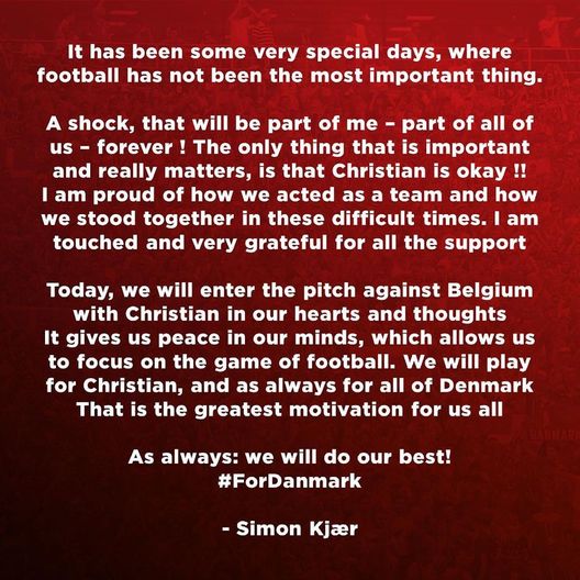 "Sono stati giorni molto speciali in cui il calcio non è stato la cosa più importante. Uno shock che siederà in me - e in tutti noi - per sempre! L'unica cosa che conta e che conta è che Christian stia bene!! Sono orgoglioso di come abbiamo agito come squadra e di come siamo stati uniti in questo periodo difficile. Sono commosso e profondamente grato per il supporto. Andiamo in campo contro il Belgio con Christian nel cuore e nella mente. Ci dà una calma che ci permette di concentrarci sul calcio. Giochiamo per Christian, e giochiamo come sempre per tutta la Danimarca. Questa è la motivazione più grande che possiamo ottenere. Come sempre: facciamo del nostro meglio!", le parole di Kjaer.