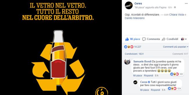 Questa frase, e per dirla tutto, anche il resto del discorso è finito al centro delle polemiche ed è pure diventato l'argomento di uno dei post della Ceres che scrive a Buffon: "Il vetro nel vetro. Tutto il resto nel cuore dell'arbitro. Gigi ricordati di differenziare". Su Facebook questa foto ha raccolto più di 10mila mi piace e altrettanti commenti tra cui quella di alcuni juventini: "Da juventino questa mi ha steso.. e direi che oggi è proprio il giorno giusto per farsi fuori 8-9 ceres, così per provare a riprendersi". W l'ironia.