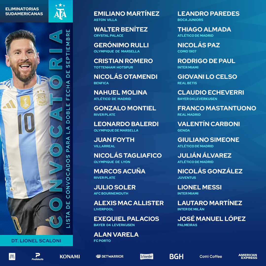 Il CT dell'Argentina Scaloni ha diramato la lista dei convocati per le due partite di qualificazioni ai Mondiali 2026 contro Venezuela (5 settembre, ore 1.30 italiana) e Ecuador (10 settembre, all'1 di notte orario italiano).
