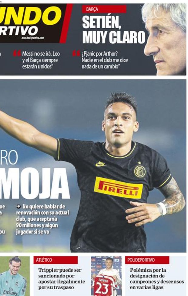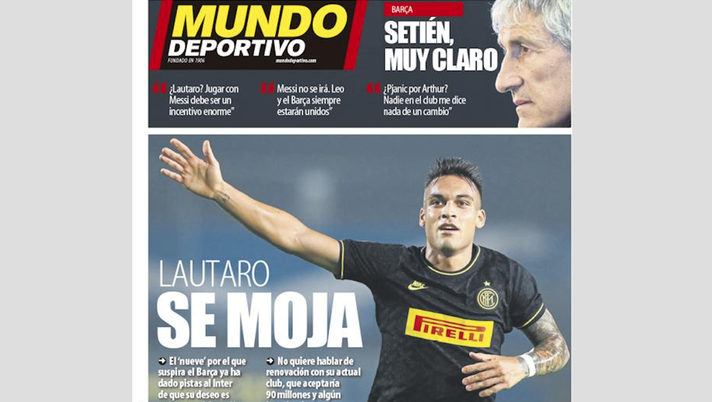 La prima pagina di Mundo Deportivo è dedicata all'interesse del Barça nei confronti di Lautaro. Questo il titolo del quotidiano spagnolo: "Lautaro prende posizione. Il nove che vuole il Barça già fatto capire all'Inter che il suo desiderio è giocare al Camp Nou. Non vuole parlare di rinnovo con il suo attuale club, che accetterebbe 90 milioni e alcuni giocatori".