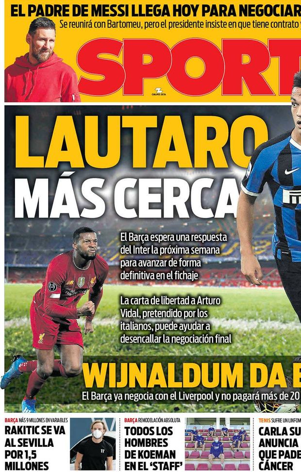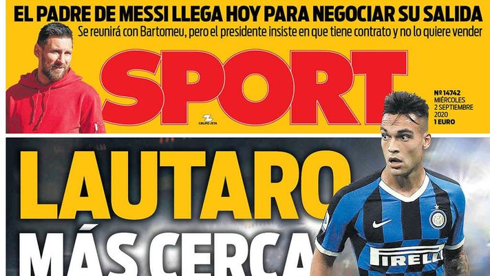 Sulla prima pagina del quotidiano spagnolo Sport si parla dell’attaccante dell’Inter nel mirino del Barcellona: “Lautaro più vicino. Il Barça aspetta una risposta dall’Inter la prossima settimana. Il via libera a Vidal, richiesto dagli italiani, può sistemare la negoziazione finale”.