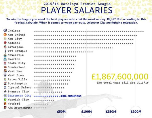 Un'impresa allucinante. Quella del Leicester è davvero una favola irripetibile, per tanti motivi. E il primo lo rende chiaro questa grafica, che mostra la classifica degli ingaggi in Premier League. In vetta c'è iL Chelsea, che supera e di molto i 200 milioni. Subito dietro, ecco il Manchester United, l'altra big che supera i 200 milioni. Entrambe le squadre, però, sono rimaste fuori dalla prossima Champions League. Sul terzo gradino del podio, c'è il Manchester City, che batte Arsenal, Liverpool, Tottenham e Newcastle, addirittura retrocesso.