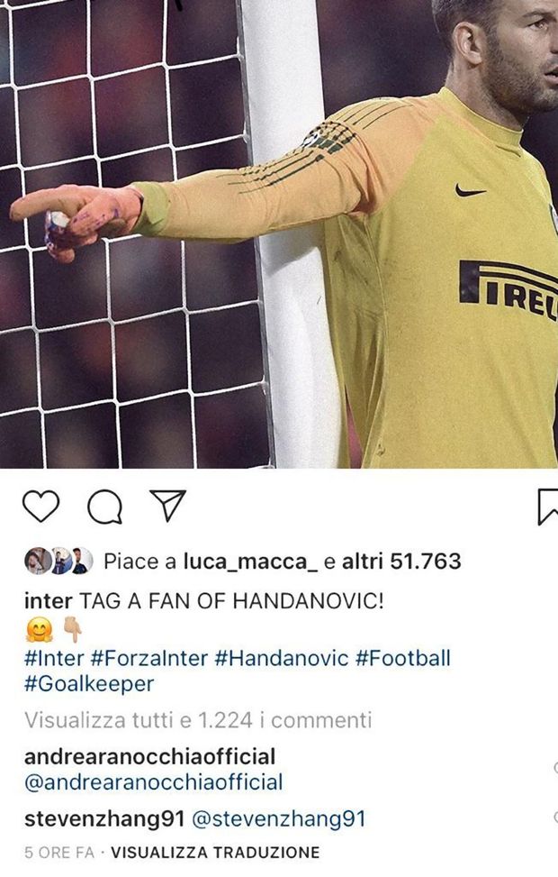 Un simpatico gioco sui social, che però dice più di quanto effettivamente espresso sulla piattaforma internet. L'Inter, con una foto di Handanovic diffusa sul proprio profilo Instagram, ha chiesto ai tifosi nerazzurri di taggare un fan del portiere sloveno, spesso criticato da una parte del popolo interista ma più volte decisivo per la squadra di Spalletti. E, simpaticamente, a rispondere non sono stati solo i "semplici" tifosi. Sia Andrea Ranocchia che il presidente Steven Zhang, infatti, hanno taggato loro stessi, in segno di ammirazione e rispetto nei confronti di Handanovic. Quando i social svelano tanto del grande rapporto all'interno di un club.