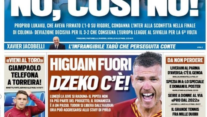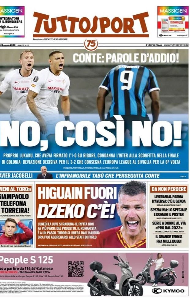 "No, così no!". E' questo il titolo scelto da Tuttosport in edicola sabato 22 agosto 2020 per commentare la sconfitta dell'Inter per 3-2 nella finale di Europa League contro il Siviglia. "Proprio Lukaku, che aveva firmato l'1-0 su rigore, condanna l'Inter alla sconfitta nella finale di Colonia: deviazione decisiva per il 3-2 che consegna l'Europa League al Siviglia per la sesta volta". Tuttosport, poi, commenta anche le parole di Conte: "Conte: parole d'addio!". Spazio anche al mercato, con Dzekoad un passo dalla Juventus: "Higuain fuori, Dzeko c'è. Il romanista è ad un passo".