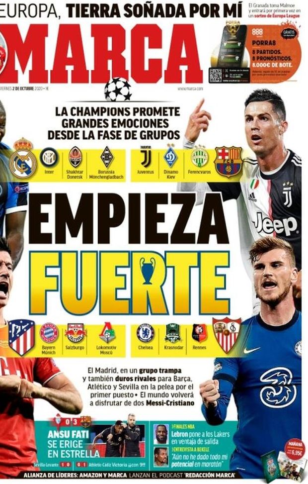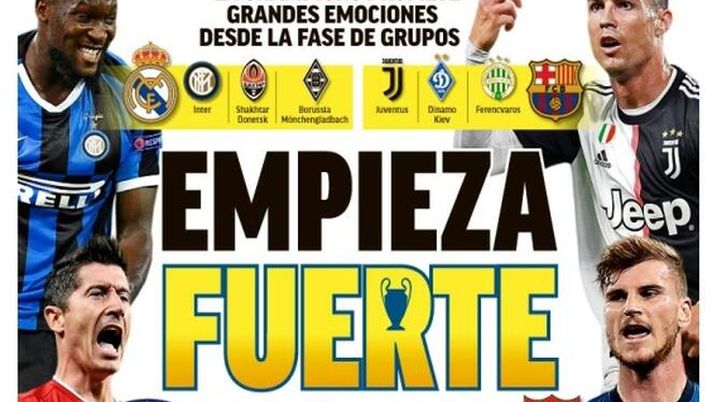 "Iniziare forte. La Champions League promette grandi emozioni dalla fase a gironi. Il Real in un gruppo trappola". Questo è il titolo scelto da Marca per commentare i sorteggi dei gironi di Champions, in particolare quello del club madrileno, finito nel gruppo B con l'Inter. A rappresentare l'Inter la foto di Lukaku.