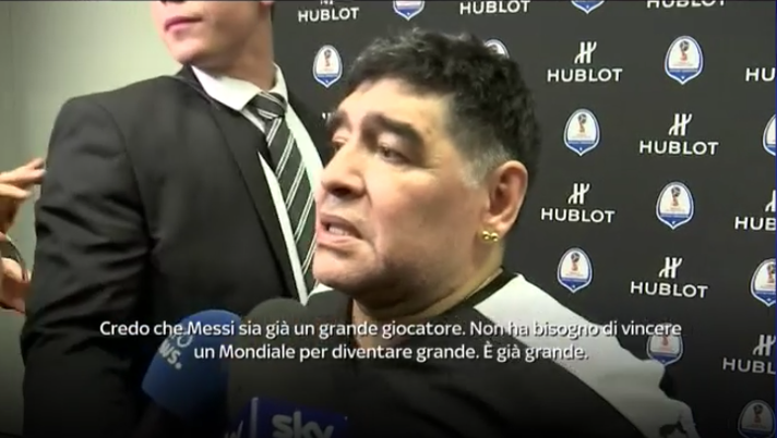 Diego Maradona era a Basilea per la 'Fiera dell'orologio'. L'ex giocatore, intervistato da Sky Sport, ha parlato del Mondiale e di Lionel Messi: "Credo che Leo sia già un grande giocatore. Non ha bisogno di vincere un Mondiale per diventare grande. È già grande. Le favorite al Mondiale? Per me la Germania, la Spagna o la Francia. Il Brasile? Deve prima di tutto recuperare Neymar e poi Tite deve assemblare al meglio la squadra, ma mi sembra che stia lavorando bene".