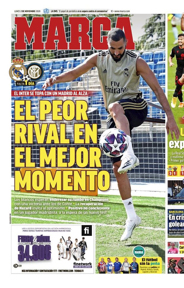 "Il peggior avversario nel miglior momento". Il quotidiano spagnolo Marca apre l'edizione di lunedì 2 novembre con la sfida di Champions League: "L'Inter incontra un Madrid in crescita".