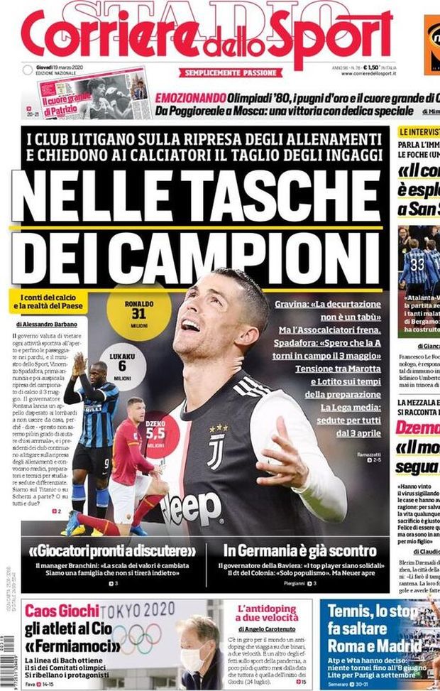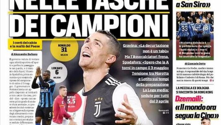 "Nelle tasche dei campioni". Il titolo principale del Corriere dello Sport si riferisce alla questione delle perdite in Serie A dopo che sono state rinviate le partite per il coronavirus. Anche Gravina ha spiegato che la decurtazione degli stipendi non è un tabù. "I club litigano sulla ripresa degli allenamenti e chiedono ai calciatori il taglio degli stipendi", continua il CdS. Si parla della ripresa il 3 maggio e si litiga sul ritorno nei centri sportivi: "Scontro tra Lotito e Marotta sui tempi della preparazione". La Lega media: sedute dal tre aprile. Il giornale sportivo parla anche di Atalanta-Valencia dal punto di vista di un immunologo: "Atalanta-Valencia è la partita zero che spiega i tanti malati e i morti di Bergamo. Il contagio è esploso a San Siro".