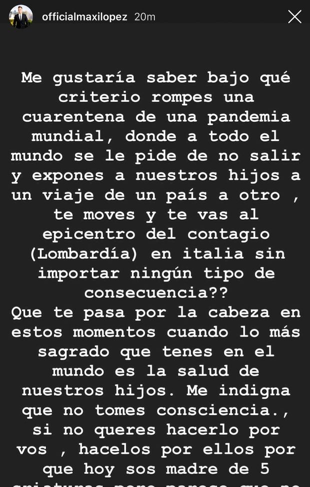 Maxi Lopez stavolta non ha gradito la decisione della ex moglie Wanda Nara. L'argentina ha fatto ritorno da Parigi insieme ai figli e a tutta la famiglia nella sua casa sul lago di Como, in Lombardia. Ecco le parole molto preoccupate di Maxi Lopez: "Vorrei sapere in base a quali criteri rompi una quarantena nel mezzo di una pandemia globale, in cui a tutti viene chiesto di non uscire, ed esponi i nostri figli con un viaggio da un paese all'altro, ti trasferisci e vai all'epicentro del contagio in Italia (in Lombardia) senza nessun tipo di conseguenza. Cosa ti passa per la testa proprio ora quando la cosa più sacra che hai al mondo è la salute dei nostri figli? Sono indignato per il fatto che non capisci: se non vuoi farlo per voi, fallo per loro perché oggi sei la madre di 5 creature ma sembra che tu non te ne sia resa conto". Giorni fa il giocatore del Crotone si era lamentato di non poter comunicare quotidianamente con i propri figli in quarantena.