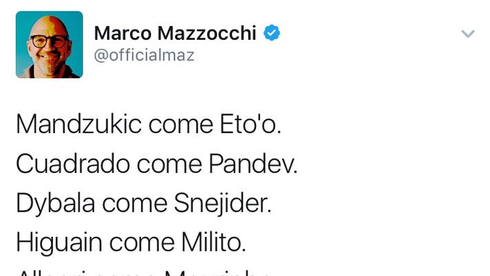 I social non perdonano, i giornalisti sportivi (e non) dovrebbero ormai saperlo. E' successo a Marco Mazzocchi, giornalista di Rai Sport, che il 12 aprile aveva fatto un tweet che esaltava la Juventus con alcuni paragoni: "Mandzukic come Eto'o. Cuadrado come Pandev. Dybala come Snejider. Higuain come Milito. Allegri come Mourinho. Come finì?"