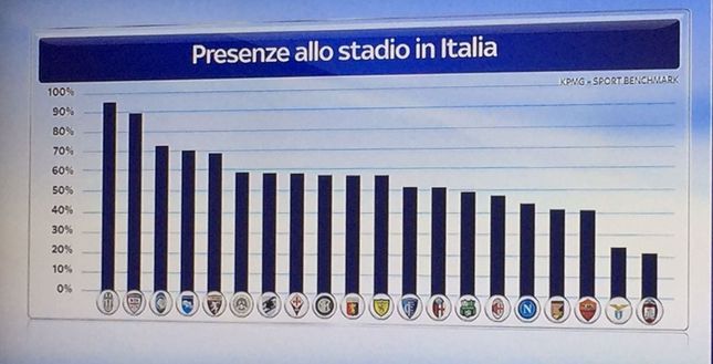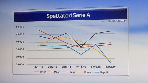 Le grafiche di Sky riportano la media spettatori dei cinque maggiori club di Serie A. Tre squadre sono in crescita: Inter, Juventus e Milan, mentre per Napoli e Roma c'è un calo degli spettatori rispetto agli anni precedenti. Analizzando i dati dell'Inter, dal 2011 a oggi si assiste a un incremento soprattutto negli ultimi due anni con una media di 45 mila spettatori. Un solo picco nella stagione 2014/2015 quando la media è scesa a poco più di 35 mila spettatori. Viene analizzato un altro dato che riguarda questa stagione dove la Juventus, ricordando la capienza di 40 mila persone dello Stadium, è in vetta alla percentuale di spettatori. L'Inter si attesta al nono posto delle venti squadre di Serie A con quasi il 60%.