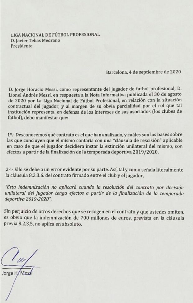 Jorge Horacio Messi, come rappresentante del giocatore Lionel Messi, in risposta alla nota informativa pubblicata il 30 agosto 2020 dalla Liga, in relazione alla situazione contrattuale del giocatore devo manifestare che: