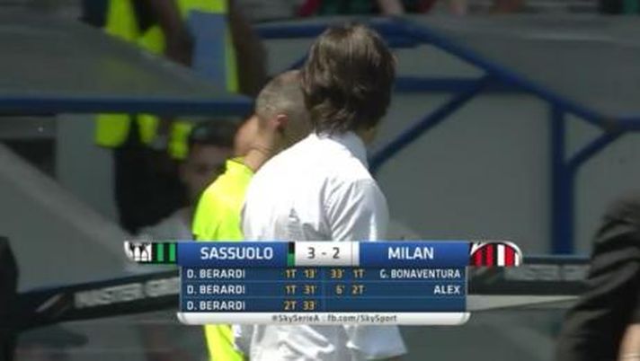 Il Sassuolo batte il Milan e tiene i rossoneri lontani dall' Inter. Ancora una volta, dopo la quaterna dell'anno scorso, il grande protagonista è Domenico Berardi, che ha segnato una tripletta, rendendo vani i gol di Bonaventura e Alex. I rossoneri hanno chiuso in nove per le espulsioni dello stesso Bonaventura e Suso.