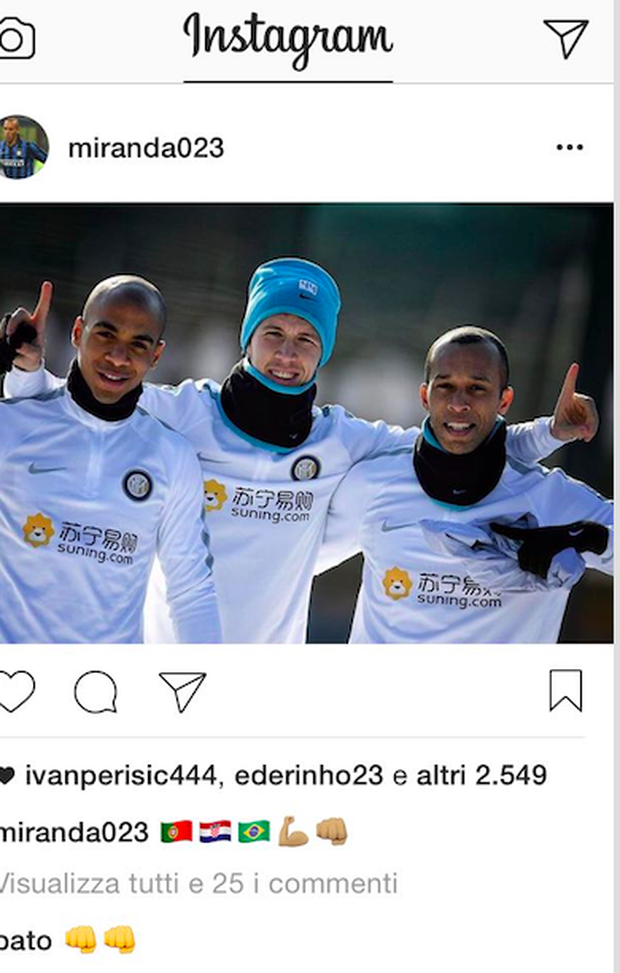 Stefano Pioli sta cementando un gruppo. Lo si capisce anche dalle foto che i giocatori dell'Inter postano sui social. E' il turno di Joao Miranda che si mette in posa con Ivan Perisic e Joao Mario. L'immagine finisce su Instagram. E a dare la carica al capitano del Brasile c'è anche l'ex milanista Pato, adesso al Villarreal.