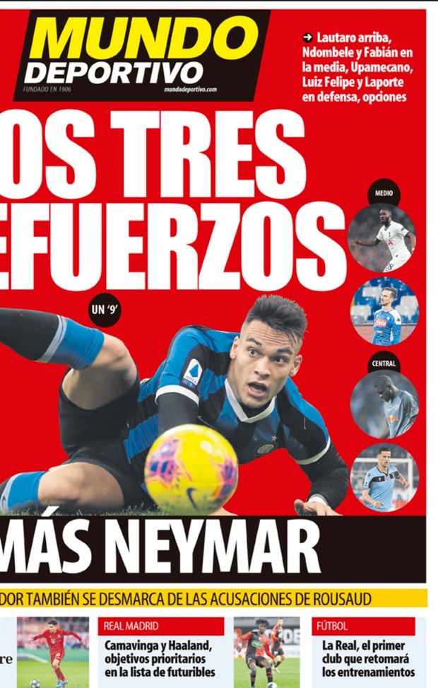 Anche oggi, domenica 12 aprile, il Mundo Deportivo, quotidiano sportivo spagnolo, apre con il futuro di Lautaro Martinez, obiettivo di mercato del Barcellona. "I tre rinforzi più Neymar - si legge -. Il Barça cerca un'ariete, un centrocampista fisico e un centrale oltre all'opzione Neymar. Lautaro in attacco, Ndombele e Fabian a centrocampo, Upamecano, Luis Felipe e Laporte in difesa le opzioni".