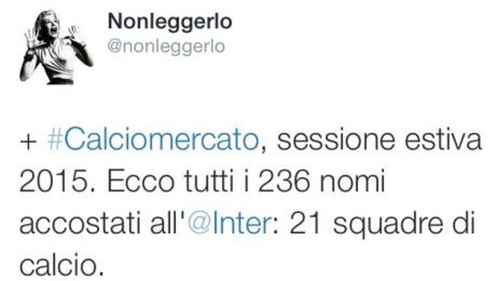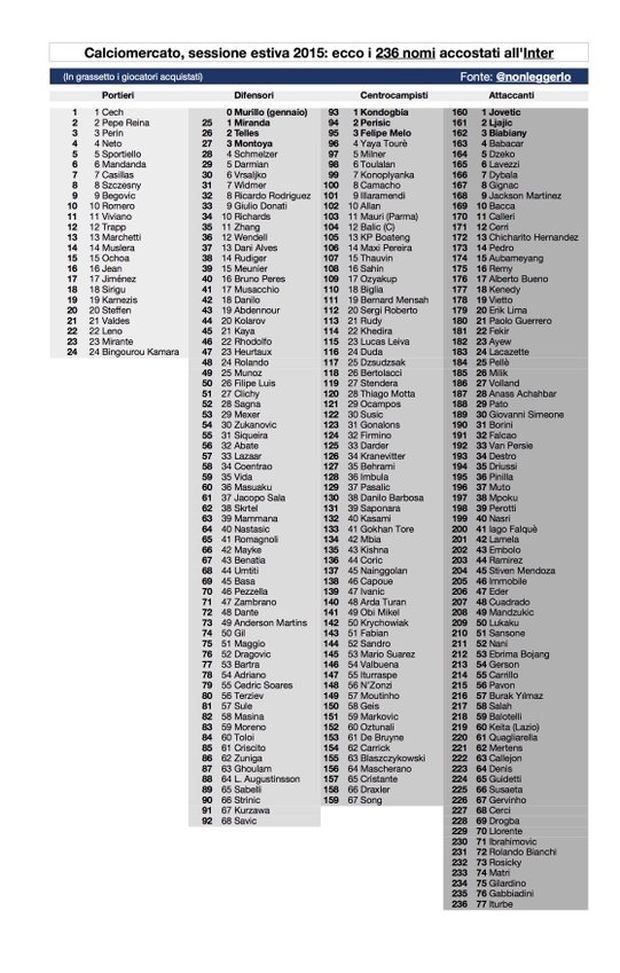 Il calciomercato fa sognare i tifosi, li appassiona e spesso li illude. E' quello che si evince da una ormai consolidata abitudine di Nonleggerlo, blogger seguitissimo su Twitter e appassionato alle vicende nerazzurre. Anche in questa sessione estiva di calciomercato Nonleggerlo si è preso la briga di contare tutti i nomi accostati all'Inter. Il numero è sbalorditivo: 236! "21 squadre di calcio" ha aggiunto il blogger, allegando il file che li nomina tutti, suddivisi per ruolo. Contiamo addirittura 24 portieri e 77 attaccanti. Dai nomi più famosi a quelli meno noti. Perché se nel calciomercato estivo non vieni accostato all'Inter non sei davvero nessuno...
