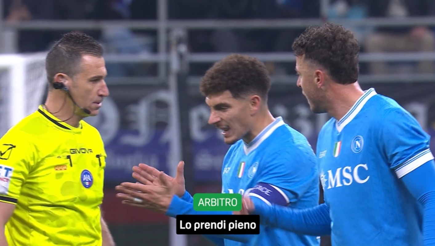 Quando arriva Doveri, il VAR propone le immagini: "Ti mostro due camere, il pallone lo tocca solo Mkhitaryan. Il 13 fa un chiaro step on foot". Dopo l'annuncio di Doveri, arriva il capitano del Napoli Di Lorenzo e Doveri gli dice: "Lo prende pieno". Arriva anche Rrahmani e Doveri conferma: "Lo prendi pieno".