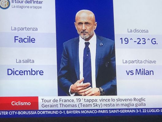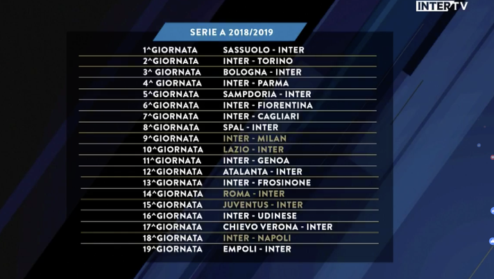 In collegamento con gli studi di Sky, Andrea Paventi commenta il calendario dell'Inter: "I nerazzurri sono arrivati a Nizza dove domani affronteranno il Chelsea di Maurizio Sarri nell'International Champions Cup. Il calendario dell'Inter risulta parzialmente favorevole all'inizio ma complicato nel mezzo quando entrerà anche nel vivo la fase a gironi della Champions League. A dicembre - quando ci potrebbe essere un turno decisivo - quella gara sarà preceduta dalla trasferta a Torino dove i nerazzurri affronteranno la Juventus in un dicembre di fuoco"