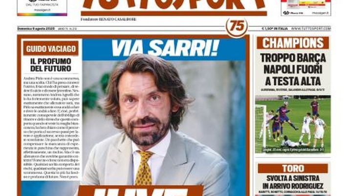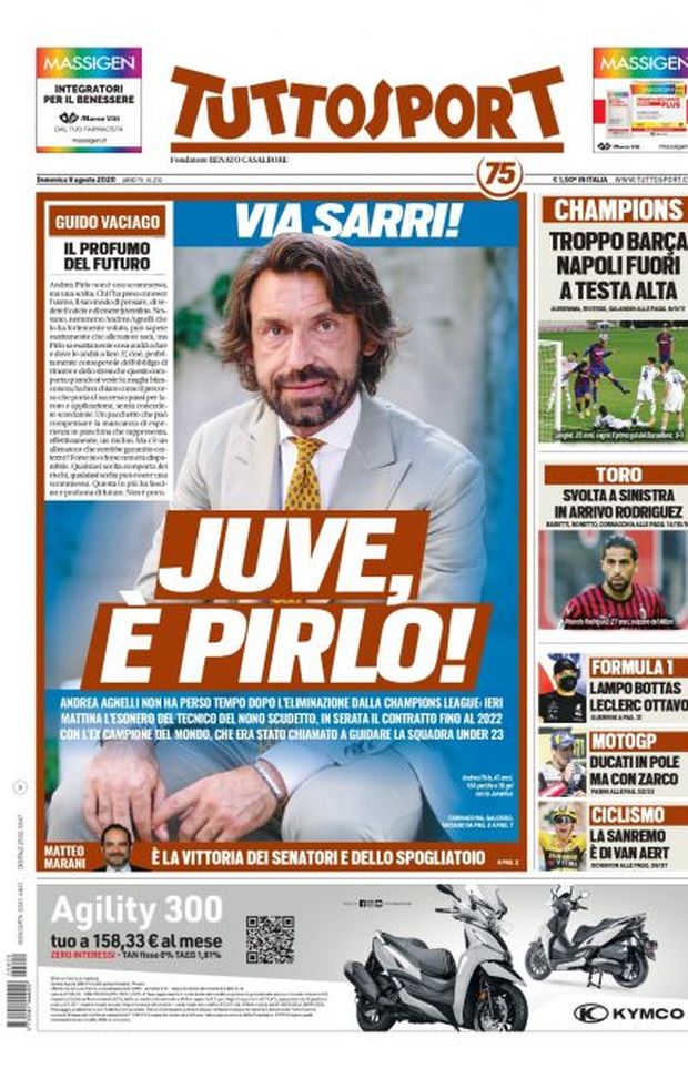Sulla prima pagina di Tuttosport si parla del cambio della guida tecnica in casa bianconera: "Juve, è Pirlo! Via Sarri!". Il quotidiano si concentra anche sulla Champions League: "Troppo Barça, Napoli fuori a testa alta".