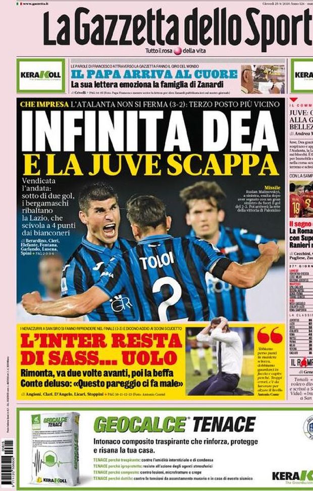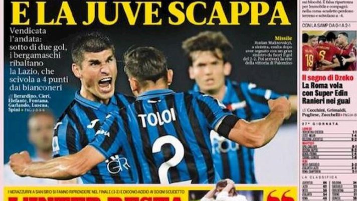 Anche La Gazzetta dello Sport in prima pagina parla del pari dei nerazzurri contro il Sassuolo. Questo il titolo scelto dalla rosea: "L'Inter resta di Sass...uolo. Rimonta, va due volte avanti, poi la beffa. Conte deluso: «Questo pareggio ci fa male. I nerazzurri si fanno riprendere nel finale e dicono addio al sogno scudetto». Il titolo principale è "Infinita Dea e la Juve scappa".