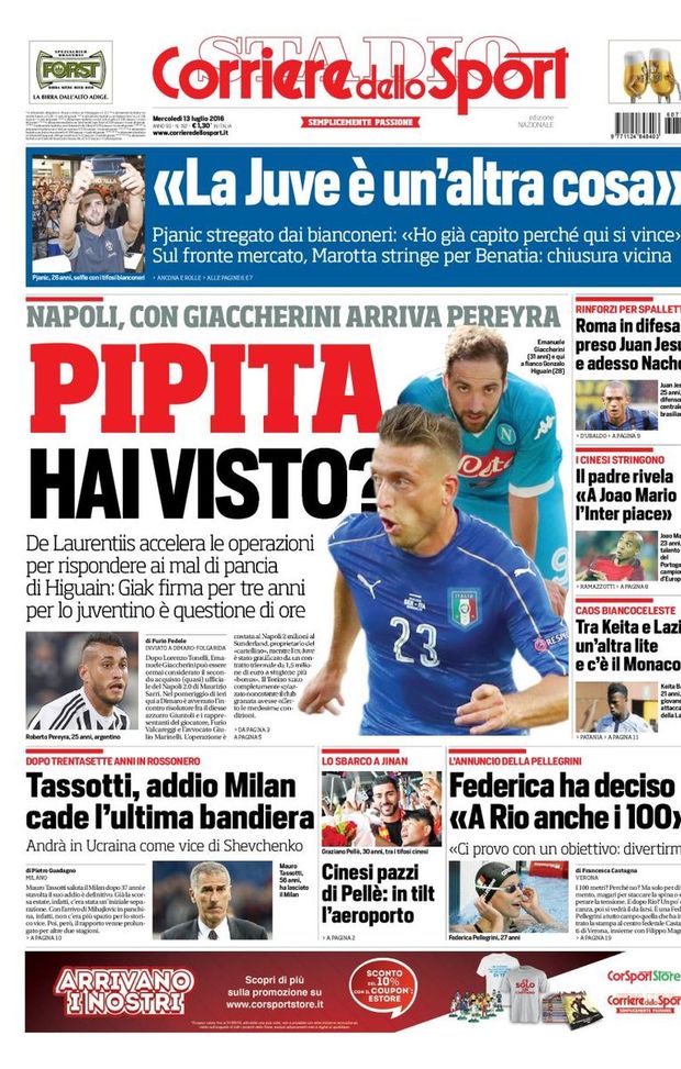 Ampio spazio alla trattativa Inter - Joao Mario, con le parole del padre del calciatore, in difesa dato per concluso l'affare Juan Jesus alla Roma, nello spazio che il Corriere dello Sport dedica oggi all'Inter: