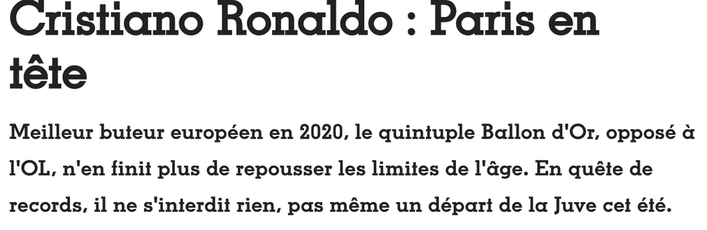 Non sembra così saldo il futuro di Cristiano Ronaldo alla Juventus, almeno secondo quanto riporta France Football. Il quotidiano sottolinea come nella testa del portoghese ci sia un'altra squadra, il Paris Saint-Germain. "Cristiano Ronaldo odia il fatto che la sua squadra non sia all'altezza. Alla sua altezza. In tali momenti, si immagina altrove. Dove capiremo. Dove gli daranno i mezzi per andare ancora più in alto. Dove lo ameranno irragionevolmente. A Parigi, per esempio. Nell'entourage molto vicino al giocatore, è stato recentemente stimato come "molto probabile" le possibilità di una partenza di CR7. Torino non è Madrid. Torino non è la Premier League. Torino è nascosta dietro le montagne. Il club potrebbe essere grande, ma la squadra non è all'altezza. CR7 non è infelice a Torino. Ma non è neanche così felice lì...", si legge sul quotidiano.