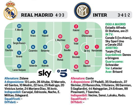 La probabile formazione dei nerazzurri in vista della sfida di Champions League a Valdebebas contro il Real Madrid di Zidane