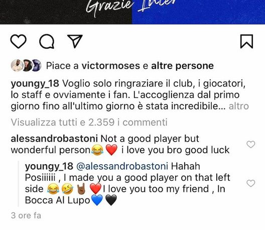 Un addio social riconoscenza e sorrisi. Ashley Young, con un post Instagram, ha salutato il mondo Inter con un lungo messaggio sentito. Non è mancato, però, qualche spunto scherzoso. Alessandro Bastoni, infatti, nel salutare l'ormai ex compagno ha scritto: "Non un buon calciatore, ma una persona meravigliosa. Ti voglio bene fratello, buona fortuna". Pronta la risposta di Young, che ha scritto: "Ahahhah ti ho reso io un buon giocatore sulla sinistra. Ti voglio bene anch'io amico mio, in bocca al lupo".