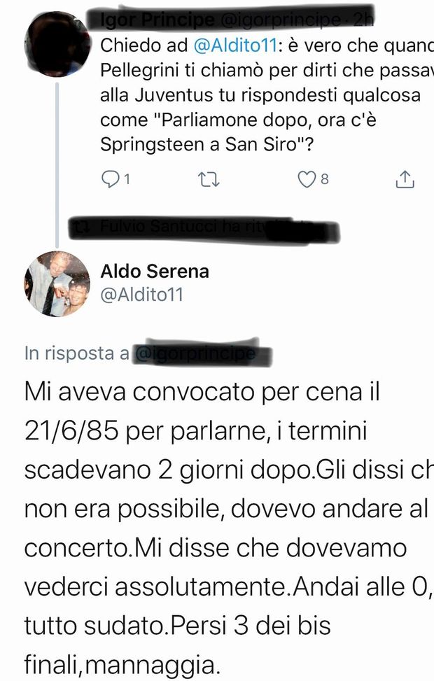 Aldo Serena ha risposto alla curiosità di un follower sui social, che lo aveva interrogato sulla veridicità di un aneddoto. L'ex giocatore nerazzurro ha rispolverato i ricordi e confermato in pieno il curioso e divertente episodio legato al suo passaggio dall'Inter alla Juventus. "È vero che quando Pellegrini ti chiamò per dirti che passavi alla Juventus tu rispondesi qualcosa come "Parliamone dopo, ora c'è Springsteen a San Siro?".