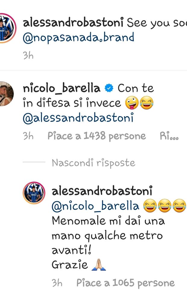 "Prese in giro da spogliatoio che finiscono sui social. Succede anche questo quando i calciatori condividono con i loro follower momenti della loro giornata o perché no consigli per gli acquisti, come direbbe Costanzo. E ieri, quando Bastoni ha pubblicato il post di uno spot pubblicitario, Barellane ha approfittato per prenderlo in giro. Il difensore ha pubblicato una foto per il brand 'No pasa nada' (Non passa niente, tradotto in italiano) e Nicolò ha colto al volo manco fosse un assist: "Con te in difesa invece, sì", ha scritto prendendolo in giro. E Bastoni ha incassato il colpo: "Menomale che mi da una mano qualche metro avanti...", ha replicato e i tifosi divertiti hanno sorriso con loro.