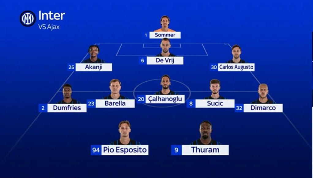 Ci saranno diversi cambi nella formazione iniziale di Chivu: "Carlos Augusto nei tre con De Vrij, a centrocampo torna Sucic, torna Dimarco a sinistra, in mezzo al campo ballottaggio Barella-Frattesi. Davanti Thuram poi Esposito in vantaggio, ma ci sono anche Lautaro e Bonny in ballottaggio. Non cambia Sommer, ma aspettiamoci che Martinez possa essere titolare nelle prossime gare".