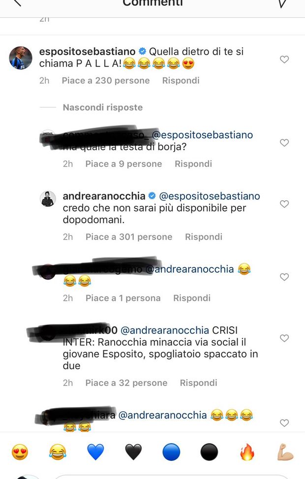 Clima disteso nello spogliatoio dell'Inter a due giorni dalla finale di Europa League contro il Siviglia. A testimonianza di ciò c'è un simpatico botta e risposta social tra Andrea Ranocchia e Sebastiano Esposito. "Quella dietro di te si chiama palla", è il commento del giovane attaccante. "Credo che non sarai più disponibile dopodomani", la risposta del difensore. "Ecco appunto, quella che vuoi prendere si chiama caviglia". "Magari prendo un po' più in alto".