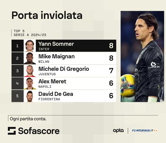 Partendo dal nostro campionato, Sommer è il portiere che ha tenuto in più occasioni la porta inviolata. Sono ben 8 le gare in cui non ha subito gol in Serie A, come lui solo Maignan del Milan.