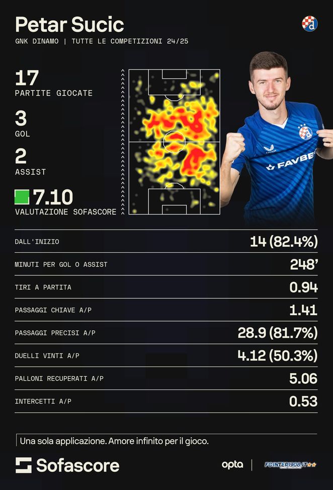 Sucic, colonna della Dinamo, è un centrocampista centrale, regista, che potrebbe raccogliere la difficile eredità di Calhanoglu. Il turco ha pochi rivali nel ruolo, ma quando è assente l'Inter fatica, anche perché Asllani non sempre è riuscito a non farne sentire la mancanza. Bravo in costruzione, ma è un giocatore che mette la gamba e va a contrasto. Non solo, si fa anche vedere con discreta continuità nei pressi della porta avversaria.