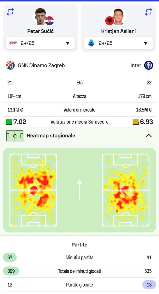 Rispetto ad Asllani, Sucic ha sicuramente una proiezione offensiva maggiore. Lo dimostra la heatmap, ma è anche un giocatore che va maggiormente a contrasto, un po' come Calhanoglu che ha dimostrato di essere un filtro importante davanti alla difesa.