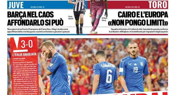 Quando si parla di sconfitta sono tutti bravi a battere in ritirata. Succede anche per quanto riguarda la nostra nazionale, sentimento vissuto in maniera contrastante a seconda dei momenti. Stefano Tamburini, giornalista del Tirreno, fa notare una curiosità. Ci siamo abituati negli anni a sentire grandi elogi nei confronti della difesa bianconera, che coincideva quasi sempre con quella della nazionale. Un po' meno quando si perdevano le partite. Il giornalista fa notare una stranezza a proposito della prima pagina di Tuttosport: "Nazionale ridicola? In prima, casualmente, nella foto della "gogna" ci sono un romanista, un interista e il milanista "traditore"." Casualmente...