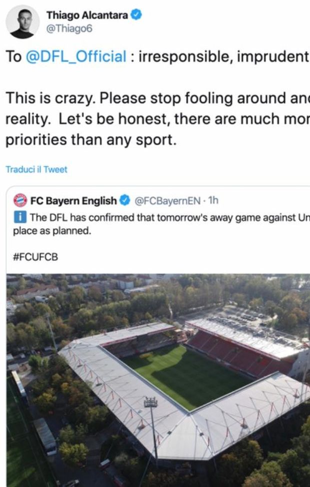 Thiago Alcantara, giocatore del Bayern Monaco, non condivide per nulla la decisione della Bundesliga di continuare a disputare le partite del campionato. Una decisione in totale contro tendenza rispetto a tutti i maggiori campionati europei e anche alla UEFA, che si stanno fermando. Il giocatore ha primo indirizzato il suo sfogo alle istituzioni del calcio tedesco, poi ha cancellato il tweet mantenendo il messaggio invariato. Il destinatario è comunque chiaro: le istituzioni del calcio tedesco: "Questa è follia. Per favore, smettetela di scherzare e tornate sulla realtà. Siamo onesti, ci sono priorità molto più importanti di qualsiasi sport".