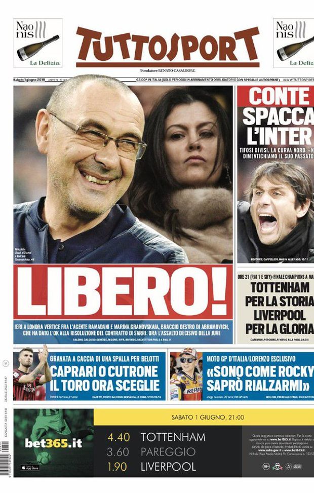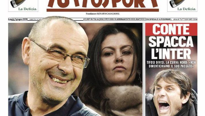 "Conte spacca l'Inter. Tifosi divisi. La Curva Nord: "Non dimentichiamo il suo passato". La prima pagina di Tuttosport in edicola sabato 1 giugno 2019 parla così di Inter nel giorno dell'annuncio di Antonio Conte come nuovo allenatore dei nerazzurri. In copertina, invece, spazio a Sarri, candidato numero 1 per il quotidiano torinese per diventare nuovo allenatore della Juventus. In taglio basso, ipotesi Caprari o Cutrone per il Torino.