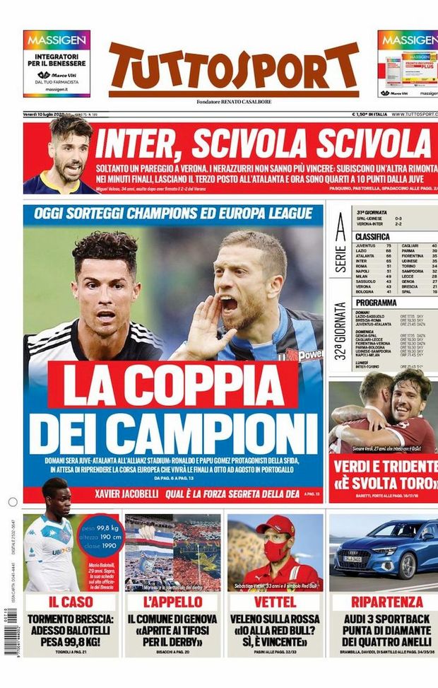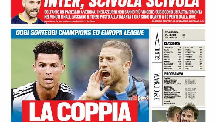 Si parla ovviamente anche del deludente pareggio dell'Inter al Bentegodi contro l'Hellas Verona, sulla prima pagina di Tuttosport in edicola nelle prossime ore. Ecco come titola il quotidiano a proposito dei nerazzurri: "Inter, scivola scivola. Soltanto un pareggio a Verona. I nerazzurri non sanno più vincere: subiscono un'altra rimonta nei minuti finali, lasciano il terzo posto all'Atalanta e ora sono quarti a 10 punti dalla Juve".