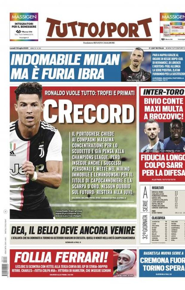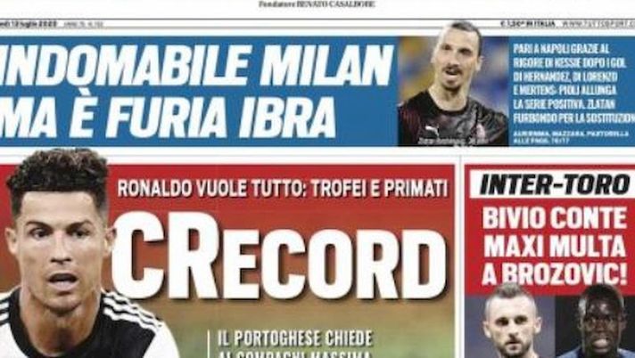TuttoSport in prima pagina parla innanzitutto di Juventus e delle voglie di Ronaldo. C'è anche la furia di Ibra che è stato sostituito da Pioli, evidentemente non se l'aspettava. E sull'Inter il titolo scelto è: "Inter-Toro, bivio Conte. Maxi multa per Brozovic".