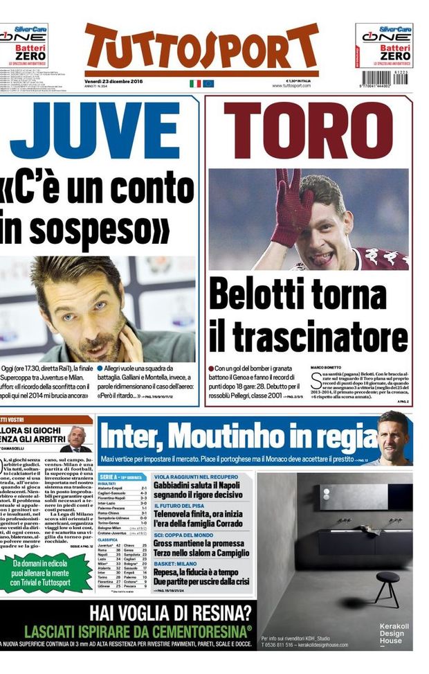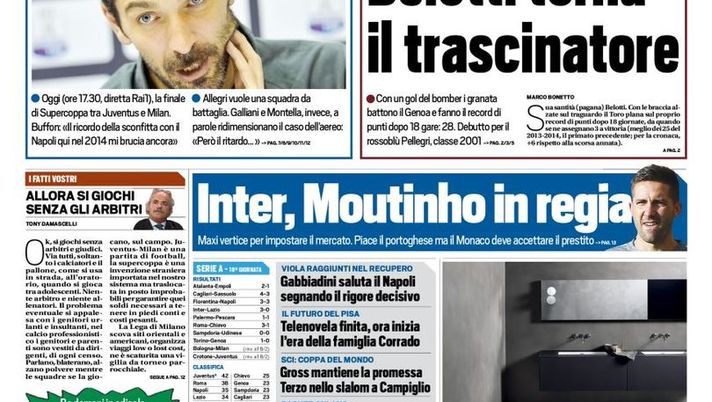 Dalla prima pagina di TuttoSport, titolo sull'Inter dedicato al mercato di gennaio. Per il centrocampo spunta il nome del portoghese Moutinho del Monaco: "Inter, Moutinho in regia. Maxi vertice per impostare il mercato. Piace il portoghese ma il Monaco deve accettare il prestito"si legge.