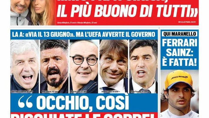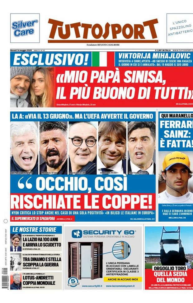 Si affronta il tema della ripartenza del campionato di Serie A sulla prima pagina di Tuttosport in edicola nelle prossime ore. In particolare, il quotidiano torna sull'ipotesi che il torneo riparta, dopo le ultime indiscrezioni, dal weekend del 13 e 14 giugno: "Occhio, così rischiate le coppe! La A: 'Via il 13 giugno'. Ma la UEFA avverte il Governo. Nyon critica lo stop anche nel caso di una sola positività: 'In bilico le italiane in Europa'".