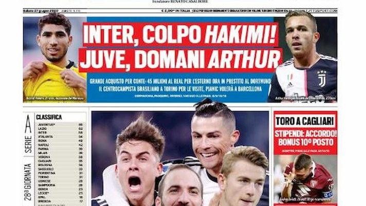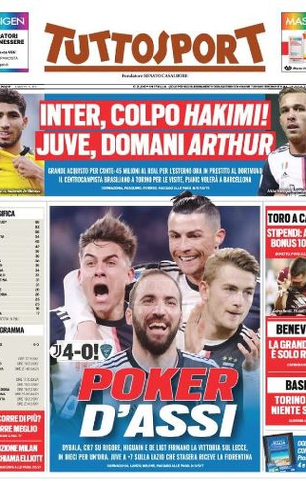 TuttoSport in prima pagina parla della vittoria della Juventus in campionato. Ma c'è spazio anche per il mercato dell'Inter nel taglio alto: "Inter, colpo Hakimi. Juve, domani Arthur. Grande acquisto per Conte: 45 mln al Real per l'esterno ora in prestito al Dortmund. Il giocatore brasiliano a Torino per le visite mediche e Pjanic volerà a Barcellona".