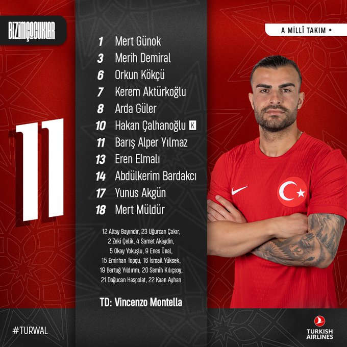 Per l'occasione, il CT Montella non fa troppi ragionamenti e punta sui titolarissimi con Calhanoglu ancora una volta titolare e capitano della squadra. In attacco c'è il madridista Guler.