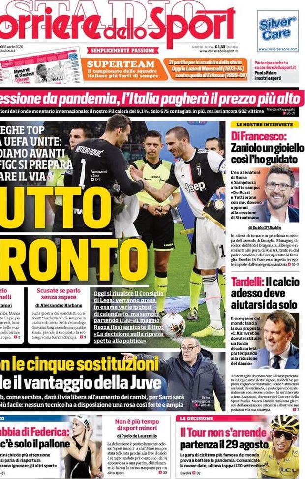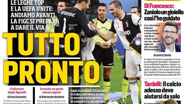 "Tutto pronto". Il Corriere dello Sport apre l'edizione di mercoledì 15 aprile con le ultime novità sulla ripresa del campionato. "Le Leghe top e la Uefa unite: andiamo avanti. La Figc si prepara a dare il via" scrive il quotidiano, che poi aggiunge: "Oggi si riunisce il Consiglio di Lega: verranno prese in esame varie ipotesi di calendario, ma sempre partendo il 30-31 maggio. Rezza (Iss) aggiusta il tiro: "La decisione sulla ripresa spetta alla politica".