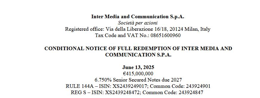 “Nel caso in cui la Condizione non venga soddisfatta (o rinunciata a discrezione esclusiva dell’Emittente) entro o alla Data di Rimborso, il rimborso potrebbe non avvenire e il presente Avviso di Rimborso potrà essere revocato. Inoltre, l’Emittente potrà, a sua esclusiva discrezione, posticipare la Data di Rimborso fino a quando la Condizione sarà soddisfatta. Di conseguenza, nessuna delle Obbligazioni sarà considerata esigibile alla Data di Rimborso a meno che e fino a quando la Condizione non sia soddisfatta o rinunciata dall’Emittente a sua esclusiva discrezione. Se la Condizione non viene soddisfatta o rinunciata, le eventuali Obbligazioni già consegnate all’Agente Pagatore saranno restituite ai relativi Titolari. L’Emittente comunicherà al Trustee e all’Agente Pagatore l’eventuale revoca del presente Avviso di Rimborso entro o alla Data di Rimborso. Fatto salvo il soddisfacimento o la rinuncia della Condizione, la data di rimborso delle Obbligazioni sarà la più tarda tra (i) il 26 giugno 2025 e (ii) il primo Giorno Lavorativo successivo al soddisfacimento o alla rinuncia della Condizione, come notificato ai Titolari dall’Emittente”.