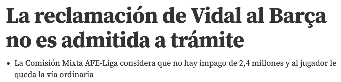 La svolta è arrivata, ma non quella che pensava Arturo Vidal. La commissione AFE-Liga, riporta il Mundo Deportivo, una volta studiata ed analizzata la denuncia presentata dal giocatore nei confronti del Barcellona, ha deciso di non accettare il reclamo dei 2.4 milioni di euro richiesti dal cileno. La motivazione? Non si tratta di un inadempimento, ma di un'interpretazione sbagliata del contratto. Il Barcellona è sempre stato tranquillo su questo fronte, ritenendo che il tutto sia una forzatura per partire a gennaio, con l'Inter pronta ad accogliere il giocatore. La denuncia è stata accolta con sorpresa dal club, che sostiene di non dovere un euro al giocatore: il cileno non ha infatti raggiunto il 60% delle presenze ufficiali e il bonus non viene ricevuto se non raggiunto.